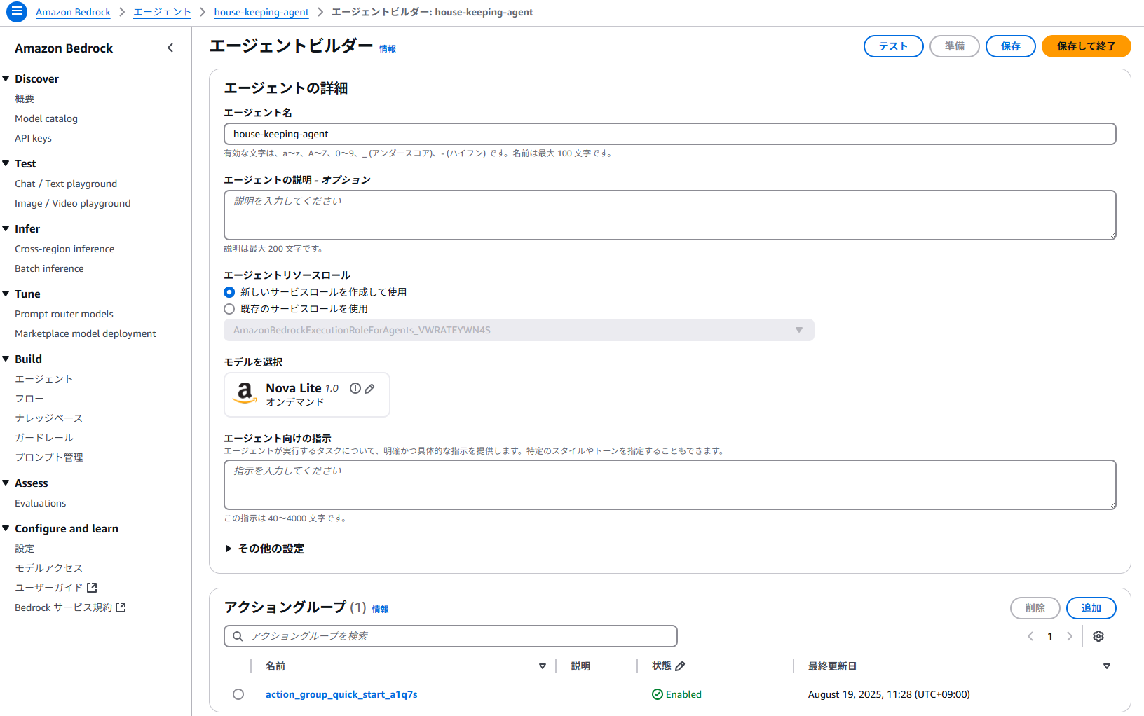 ここではモデルAmazon Nova Liteを使用します。Action groupは先ほど作成したLambda関数を選択します。