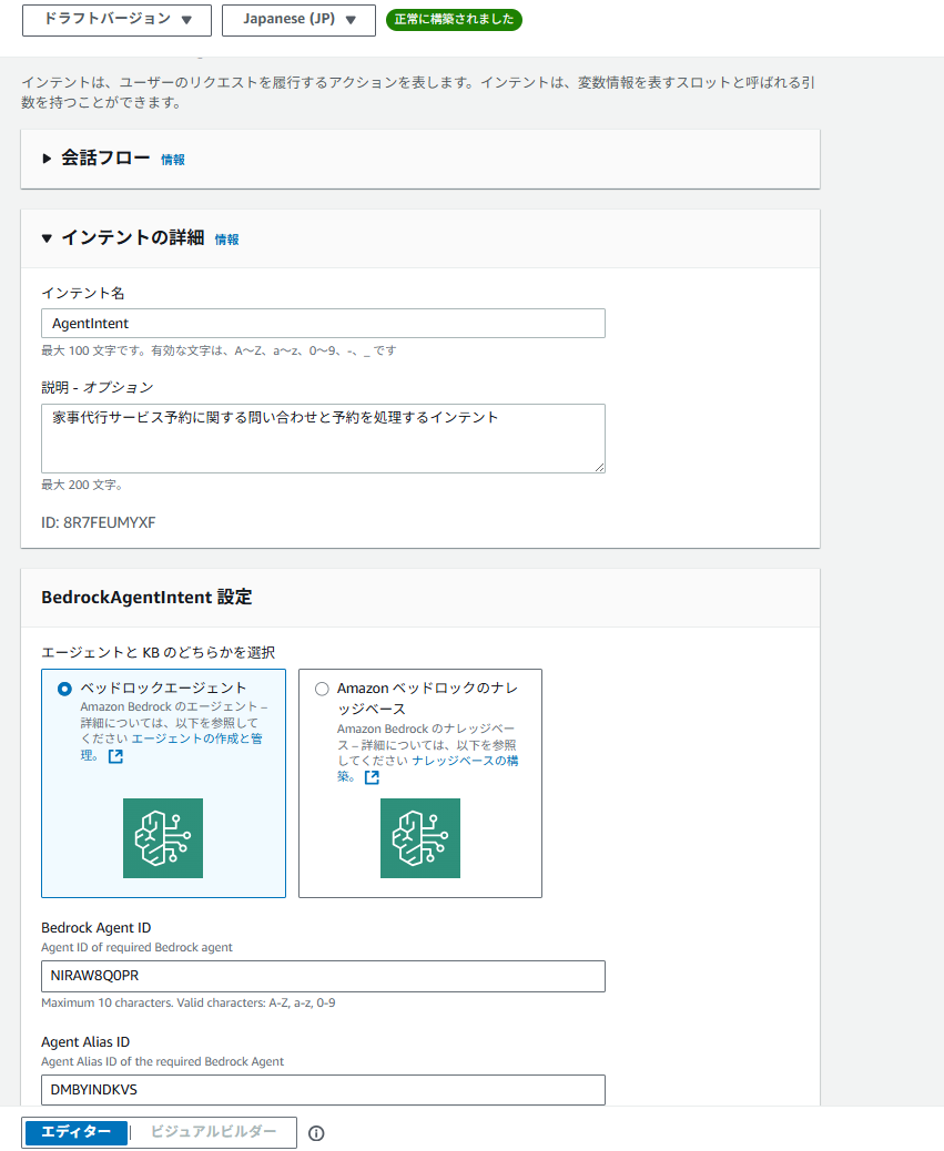 Amazon LexからBedrockエージェントインテントを有効にして、ボット作成していきます。