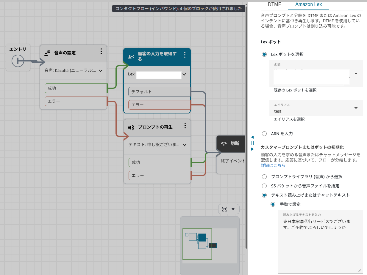 Amazon Contentコンタクトフローを作成して、4章のAmazon Lexが入力取得するように設定を行います。
