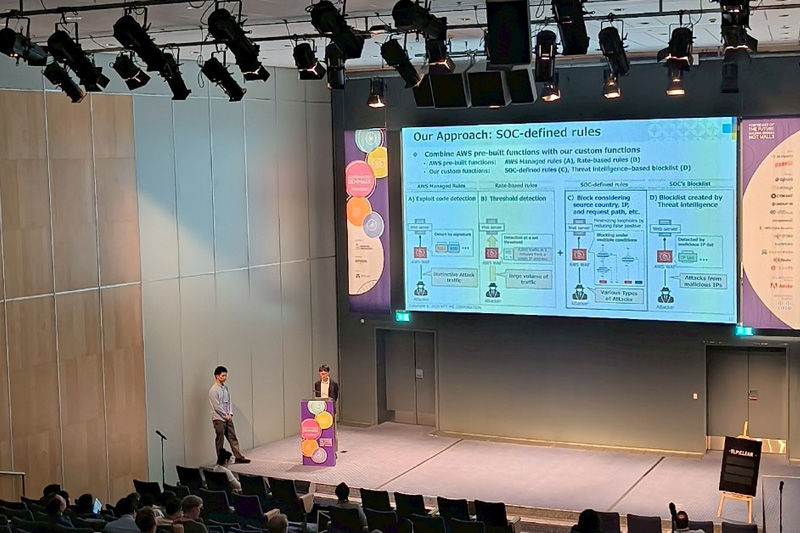 カンファレンスでは “Maximizing the Potential of AWS WAF: Fully Automating Threat Detection with Custom Managed Rules and Proprietary Threat Intelligence” と題し、NTT東日本SOCが提供するAWS WAFのセキュリティ運用サービスにおける独自技術について発表しました。