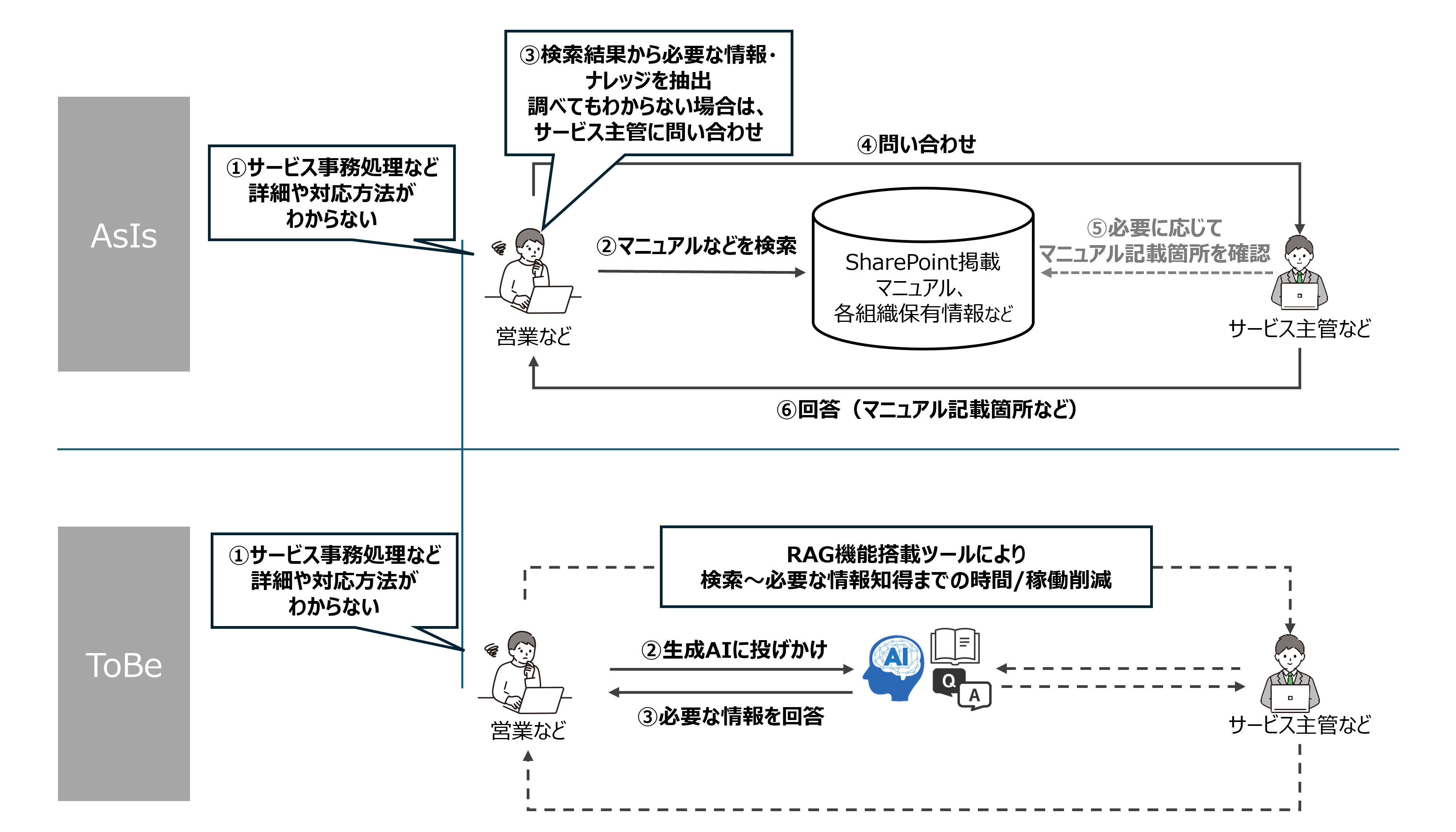 山田:私は、グループ間の連携やAIユースケースの社内展開も担当しておりまして、今回のマニュアル検索業務も、そうした取り組みの一環として推進することになりました。生成AIについては、専門的なエンジニアというよりも、業務の効率化や改善を目的に社内での活用を推進する立場で取り組んでおります。