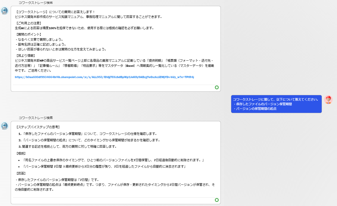 回答文には、ステップを踏んで考えたプロセスや参照した資料の根拠を含めるように指示しており、単なる結論だけではなく、どういう経緯でその答えに至ったのかがわかるようにしています。利用者が安心して活用できるよう、信頼性を担保する工夫はかなり意識しました。