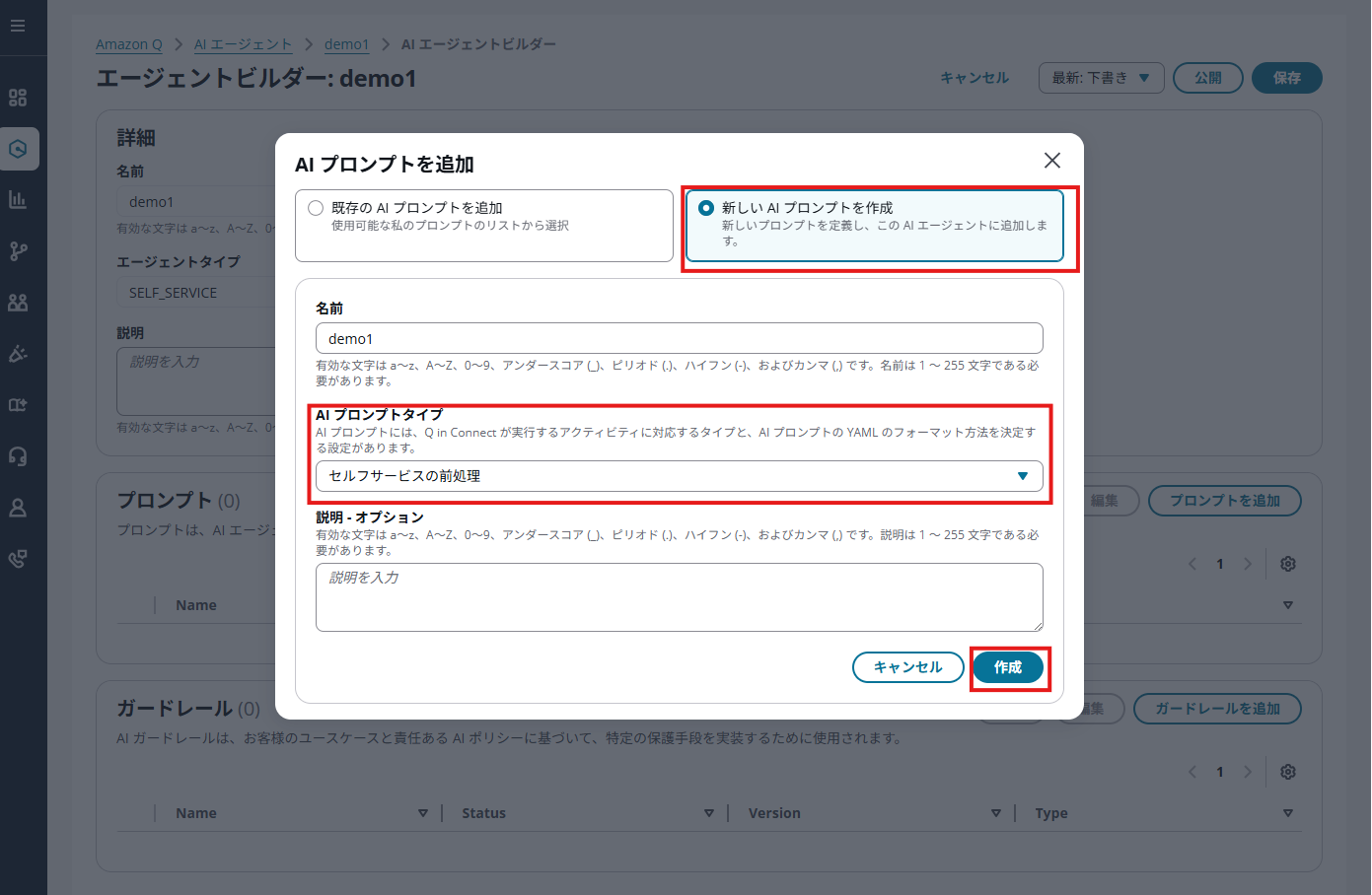 「新しいAIプロンプトを作成」から、プロンプトタイプを「セルフサービスの前処理」に指定して、「作成」ボタンをクリックします。
