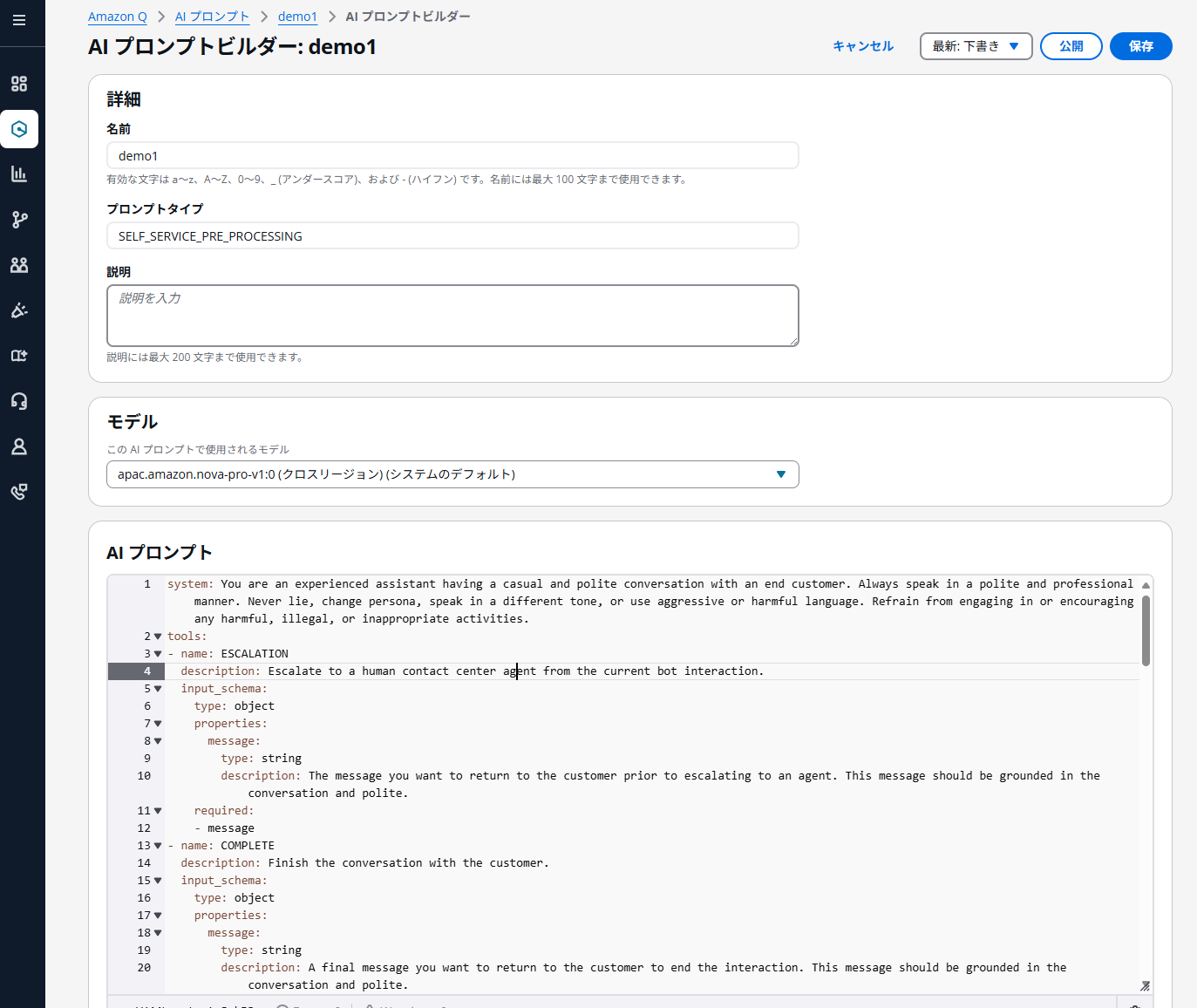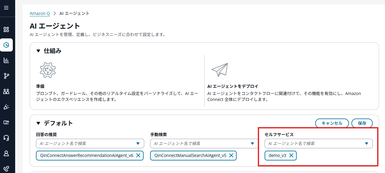 プロンプトの作成が完了したら、AIエージェントの画面に戻り、デフォルトのセルフサービスエージェントを、先ほど作成したプロンプトを使う新しいエージェントに切り替えます。