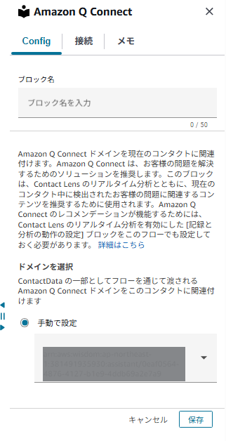 まず「Amazon Q in Connect」ブロックを配置し、初期設定で作ったドメインを登録します。