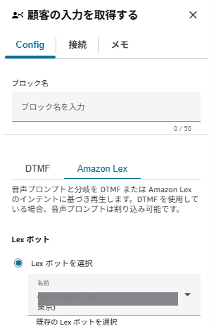 「顧客の入力を取得する」ブロックを使用して、Lexボット経由で顧客の入力を受け取ります。