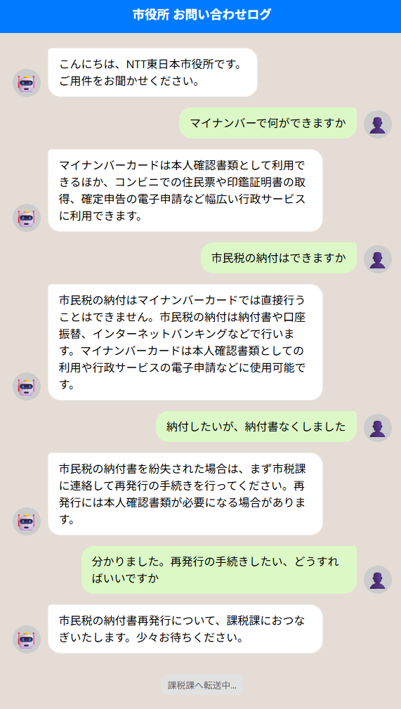 上記ログでは、エージェントが顧客の発話を正確に理解し、マイナンバーの利用方法や市民税の納付方法などを適切に案内できることが確認できました。