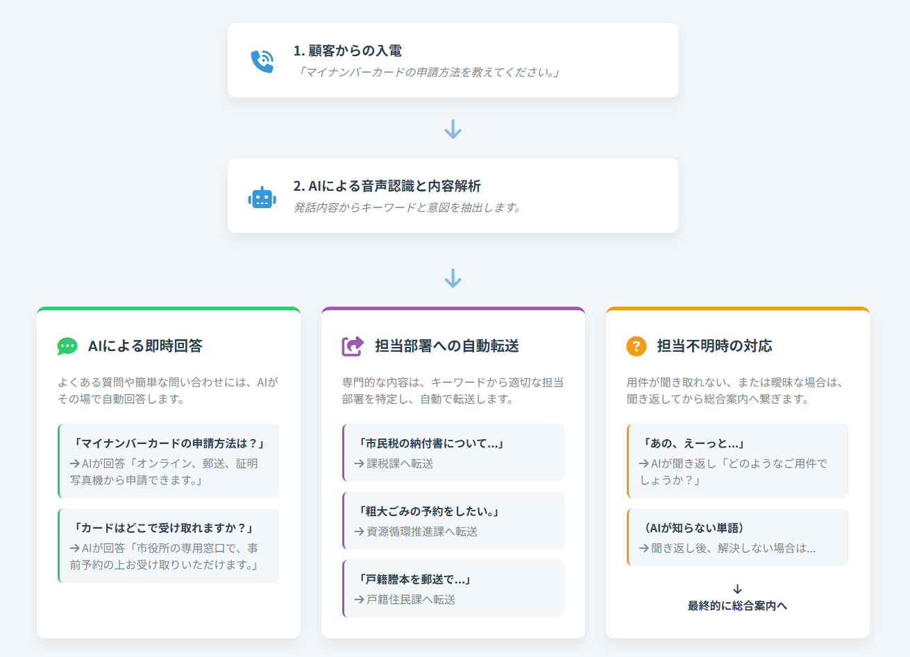 - 意味のない発話内容の場合についてまず要件を聞き返し、それでも適切な転送先が見つからない場合は最終的に「総合案内」へ転送します。