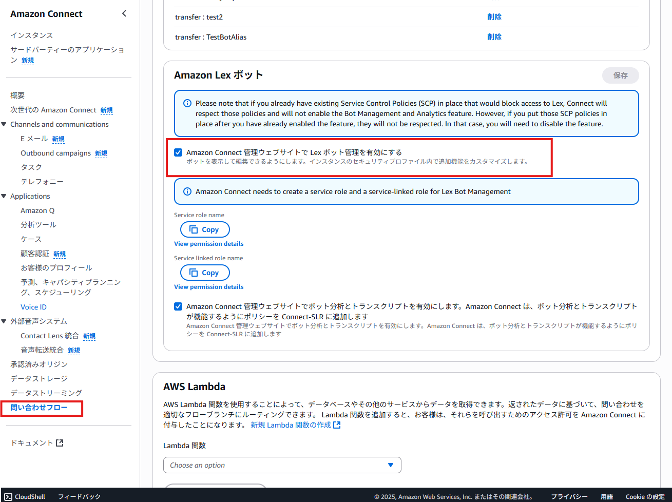 Amazon Lexボットを使用するため、次に、Amazon Connect管理画面から設定するようにチェックを入れます。