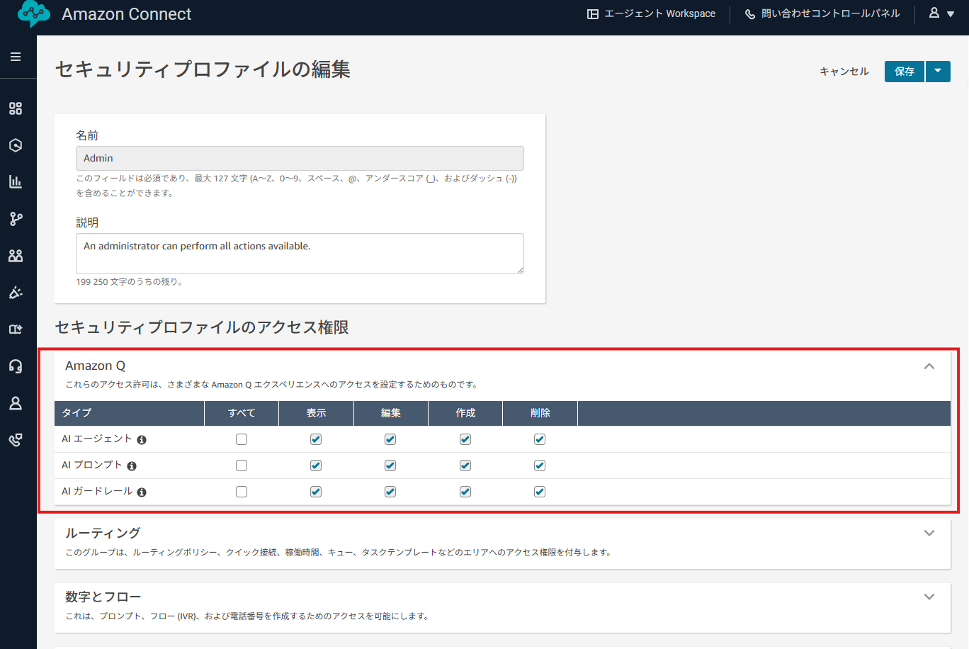 最後に、Amazon Connectの管理画面から「セキュリティプロファイルの編集」を開きます。もしAmazon Qの権限が付与されていない場合は、ここで追加してください。
