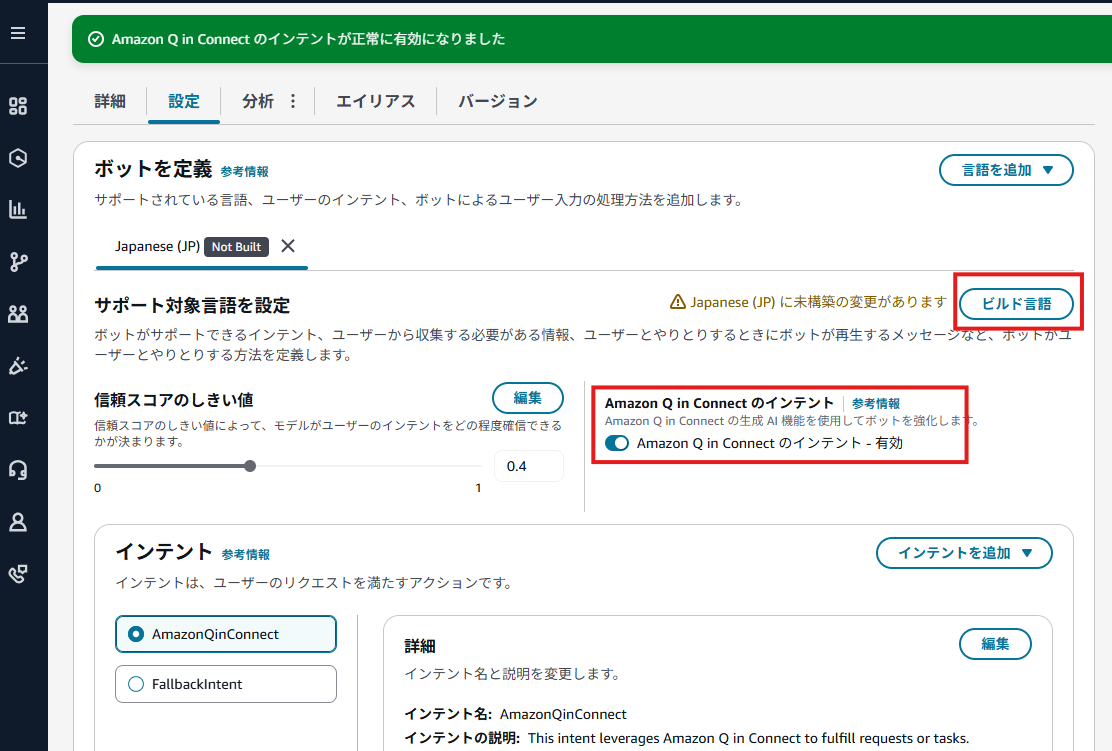 Amazon Q in Connectのインテントを有効にしてビルドを行います。バージョンとエイリアスも設定してください。