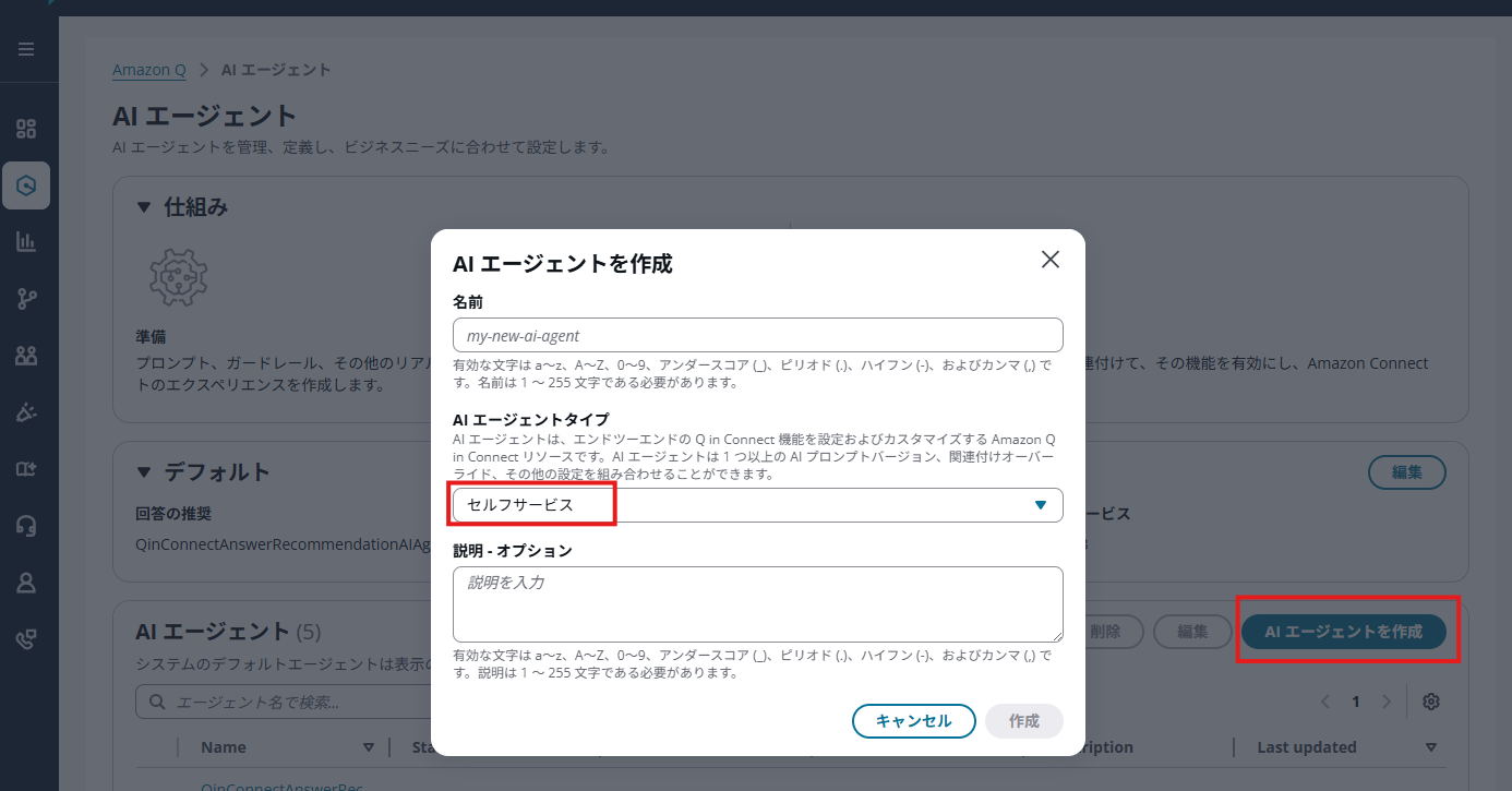 AIエージェントタイプを「セルフサービス」に指定します。