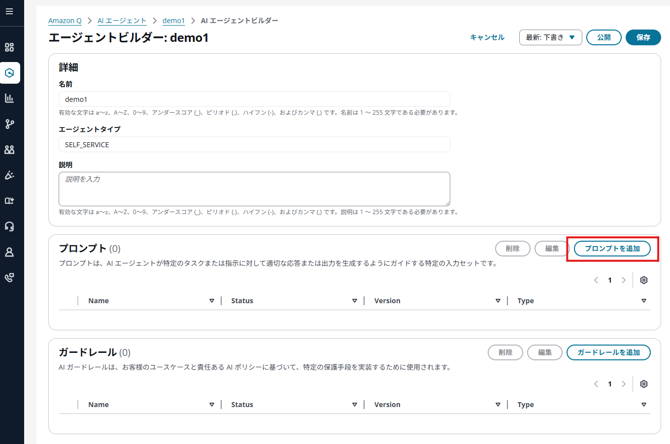 AIエージェント作成後、編集画面から「プロンプトを追加」ボタンをクリックします。