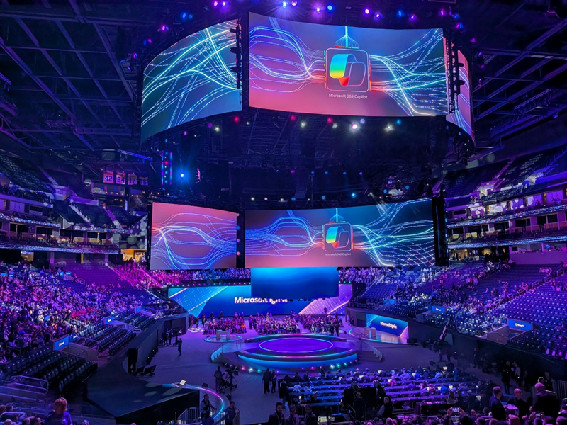 冒頭の基調講演では、業務文脈理解と高度な推論を実現するWork IQやMicrosoft 365 Copilotの進化、企業内AIエージェントの一元管理を実現するAgent 365をはじめさまざまな革新的発表がありました。当日の各発表は、円形の会場の周りに配置された舞台を活用した動きのある演出でした。