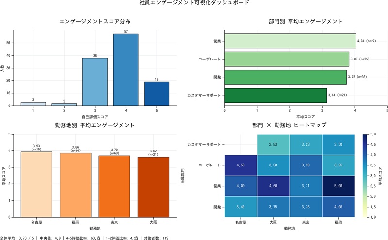 | 社員ID | 所属部門 | 勤務地 | エンゲージメント自己評価_1to5 |