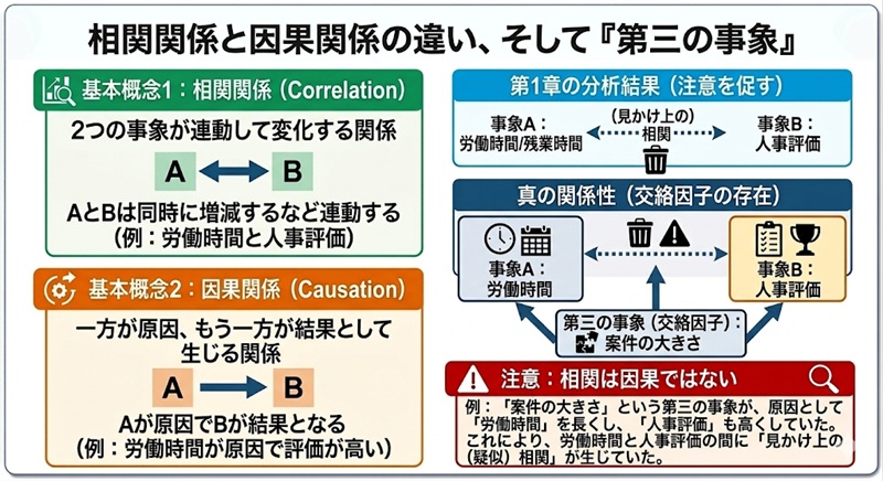 第1章では、Copilotを活用して「人事評価が高い人の傾向」を分析し、労働時間や残業時間と人事評価の間に一定の関係が見られることを確認しました。ここでは、そのような分析結果を解釈するうえで重要となる「相関」と「因果」の違いについて説明します。
