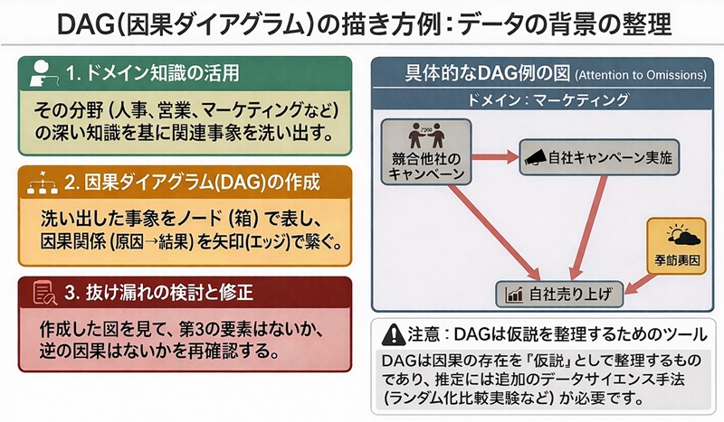 ここまでをDAGを書きながら整理できると、後からデータを収集しなおすことも少なくなるはずです。