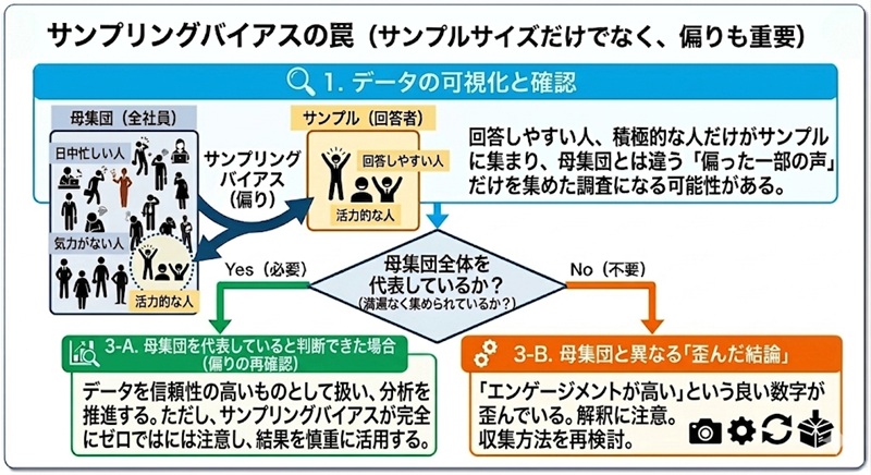 サンプルサイズは十分か 例:数十人しか回答していないのに、全社員の傾向として結論づけようとしていないか |