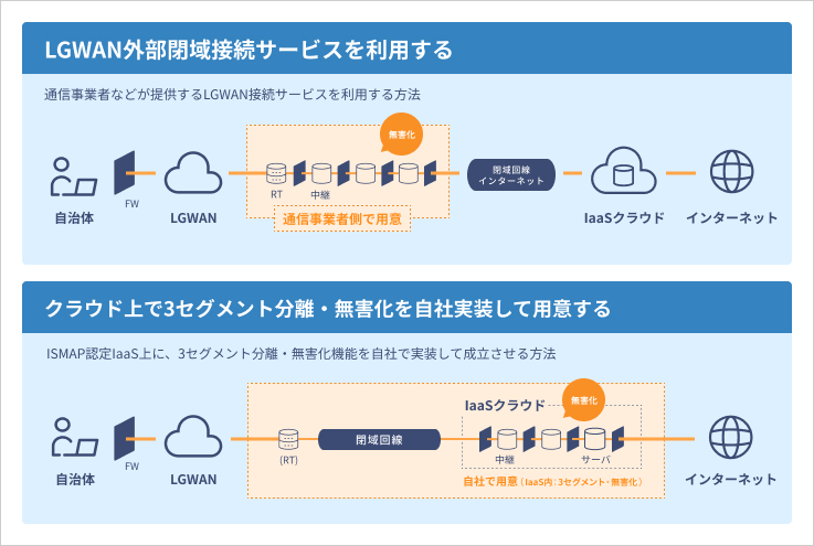 クラウド上のアプリケーションをLGWAN経由で自治体へ提供するには大きく下記の2つの方法があります。