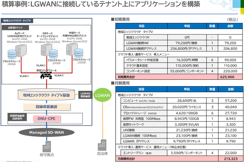 また、地域エッジクラウド タイプVのテナント上に構築した場合の一例として、初期費用 約62万円/月額費用 約21万円という積算イメージも提示しています。