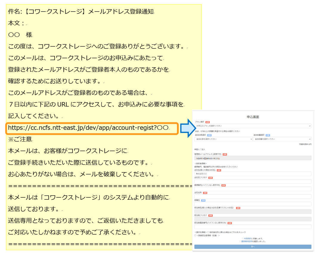 コワークストレージの新規契約のお申し込みは、コワークストレージのWebサイトとメールの2ステップで完了します。
