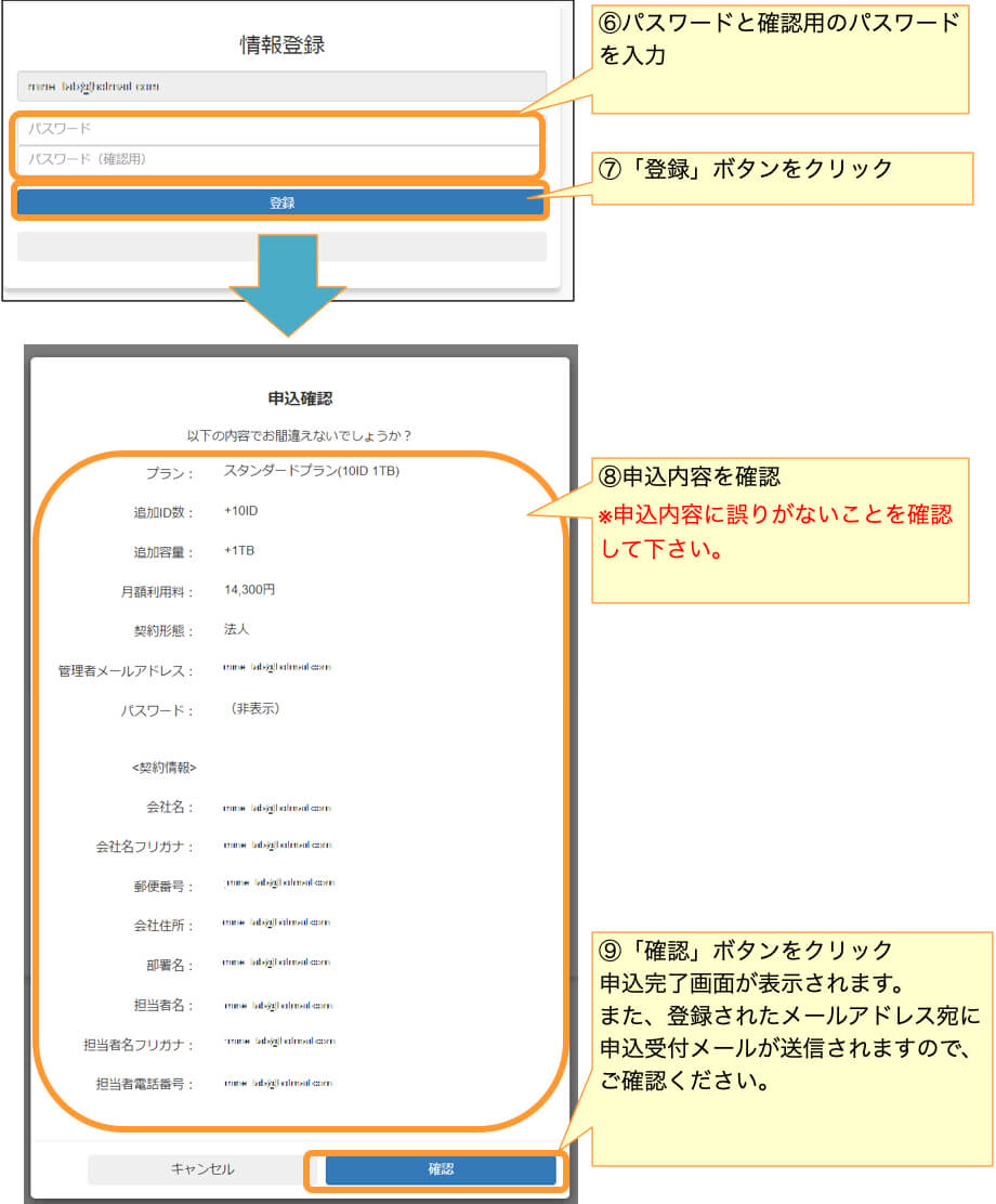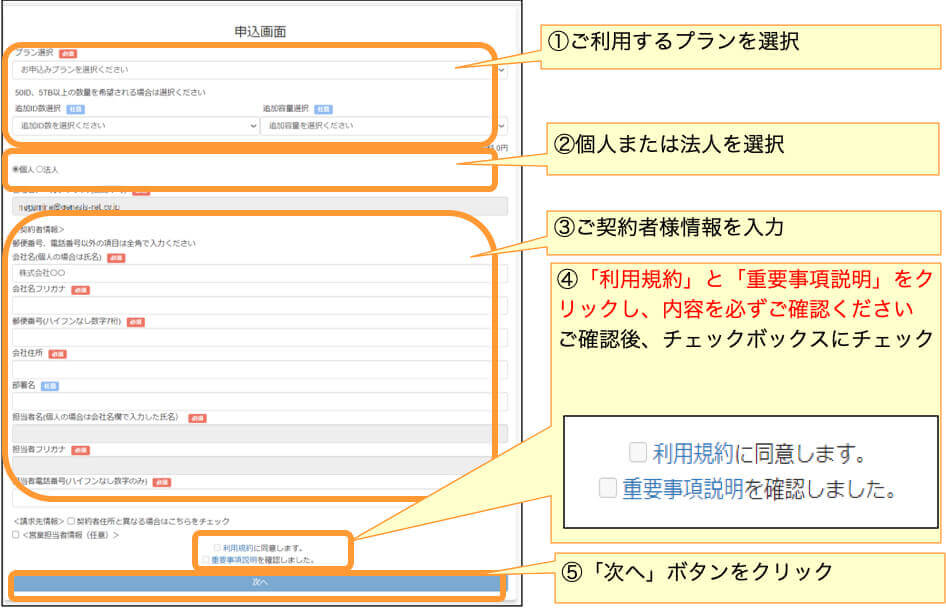 - お申し込みフォームに必要な事項を登録。すぐに初回ログインに必要なIDとパスワード等の情報をメールにて送付します。