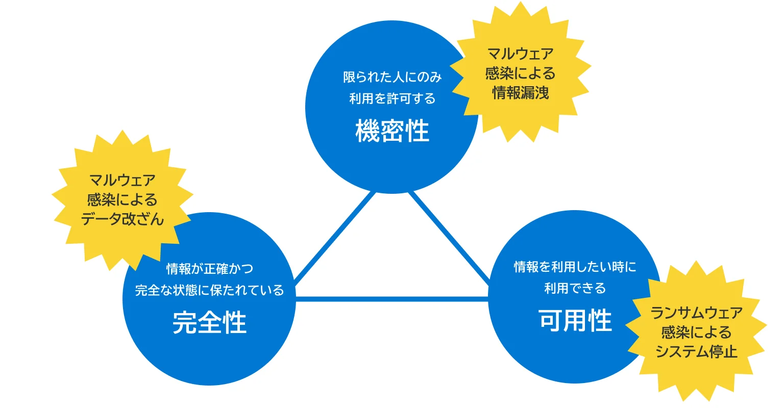 ここまで「ランサムウェア攻撃」や「マルウェア感染」など、さまざまな手法を紹介してきました。それらすべては、情報セキュリティの基本原則である「機密性」「完全性」「可用性」の3つの要素を侵害することを目的としています。