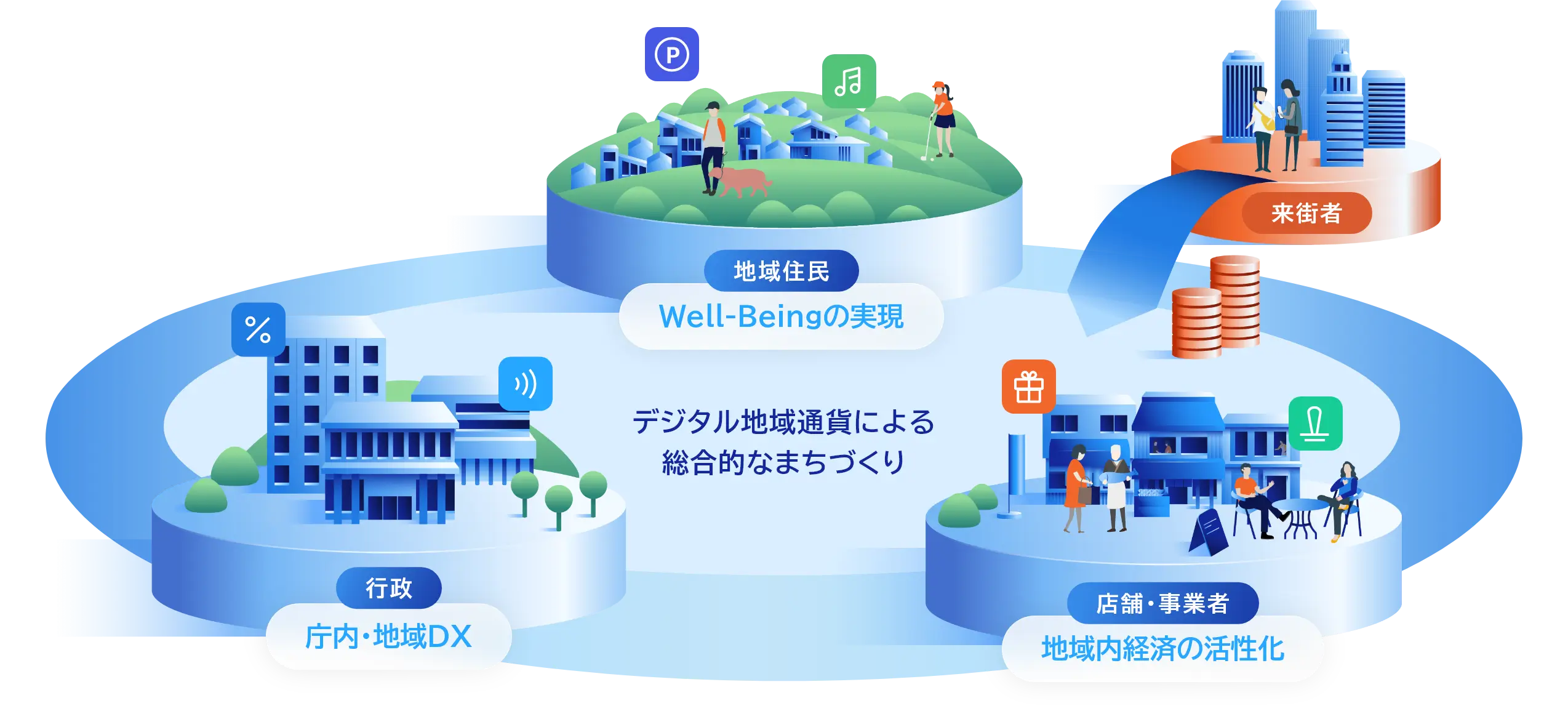特定の地域の中で流通し参加店舗で使える、デジタル化された通貨です。地域の経済やコミュニティの活性化につながるプラットフォームとして、近年自治体から注目を浴びています。