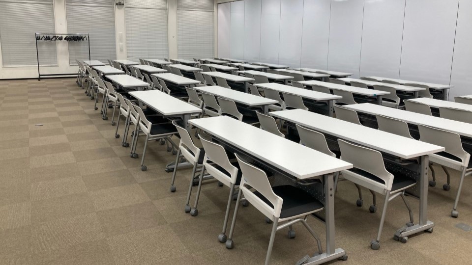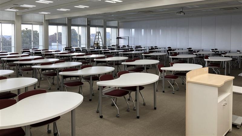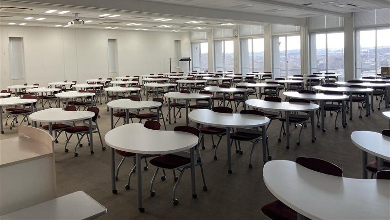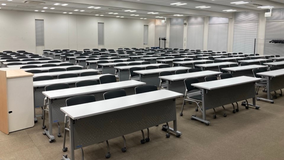 テーブルは長机でスクール形式のレイアウトとなっており、各種研修、セミナー、資格試験、検定試験などの会場にも使われています - 4つの教室を1つに構成し、最大360名収容とすることも可能です