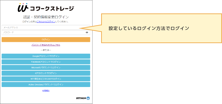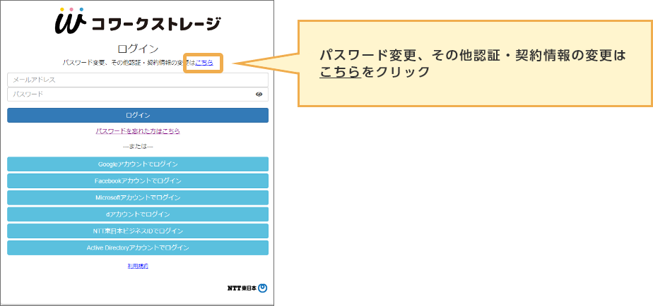 - ログイン画面にアクセスし、「パスワード変更、その他契約情報の変更はこちら」をクリックします。