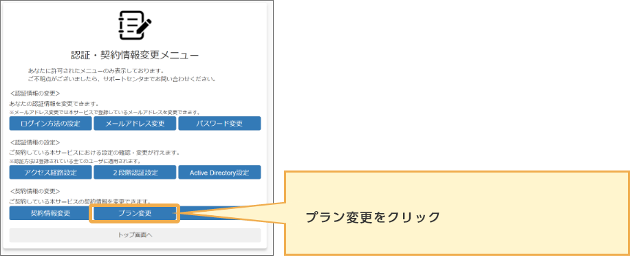 - 契約情報変更メニュー画面が表示され、プラン変更をクリックします。