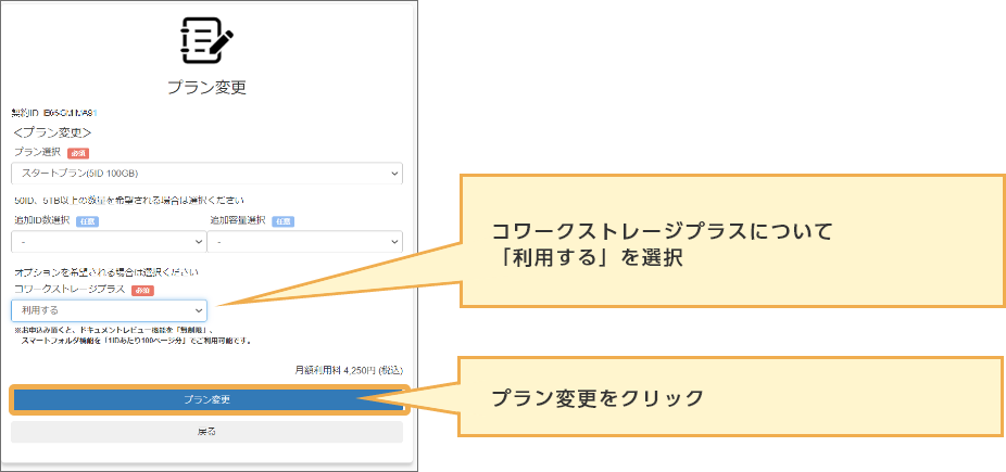 コワークストレージプラスについて、「利用する」を選択し、「プラン変更」をクリックします。 -