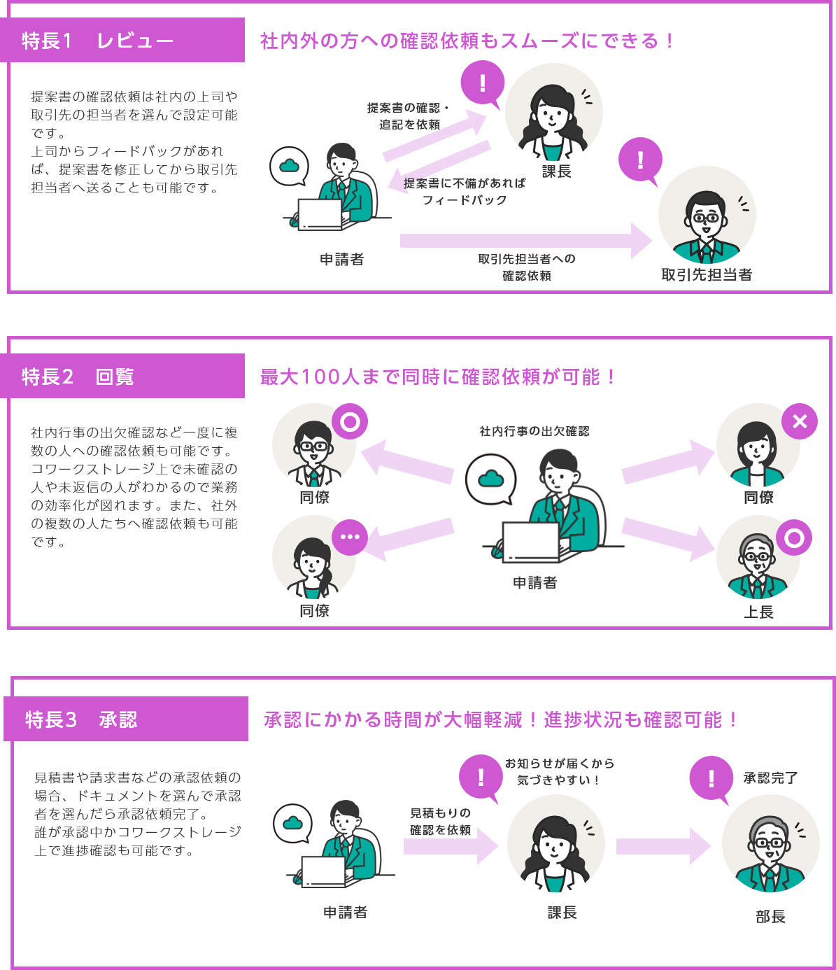 コワークストレージ上での簡単な操作で、ドキュメントごとに「レビュー」「回覧」「承認」依頼を作成できる機能です。