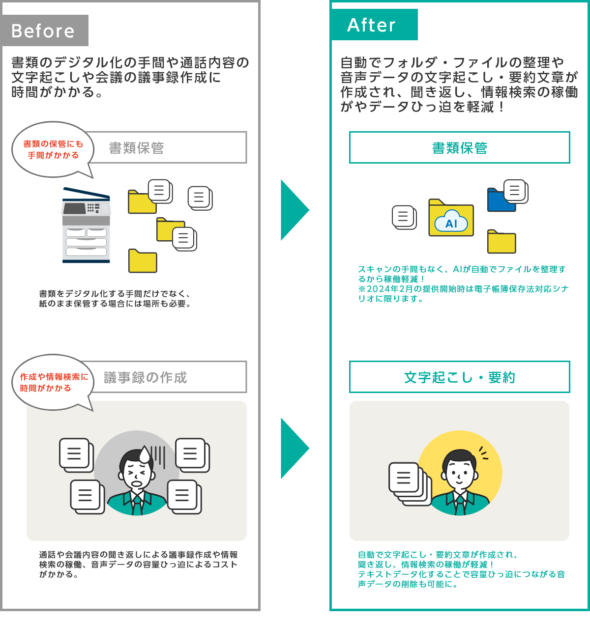 音声ファイルの文字起こし・要約により、通話や会議内容の聞き返し時間の短縮、容量ひっ迫につながる音声データの削除をすることが可能になります。