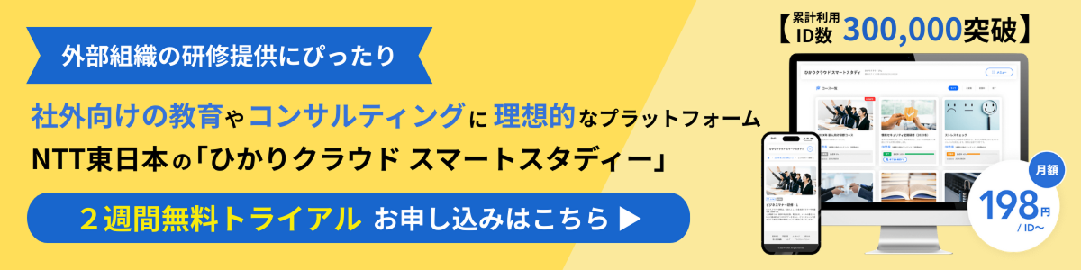 NTT東日本では、クラウド型eラーニングプラットフォームを提供しています。ご紹介した資料を活用することで、自社オリジナルの研修の提供が実現します。一度、2週間無料トライアルにて操作感などをお試ししてみてはいかがでしょうか。