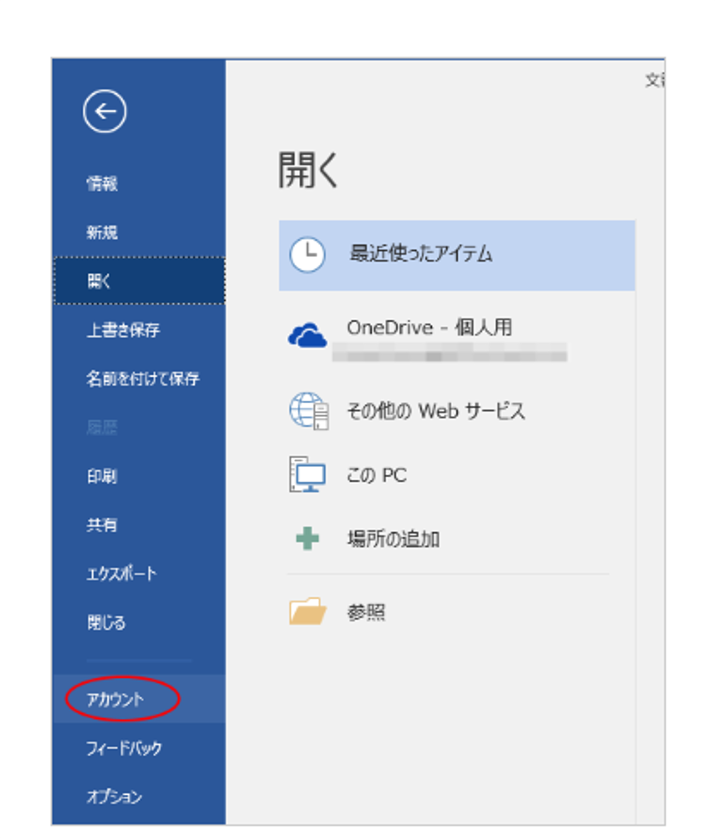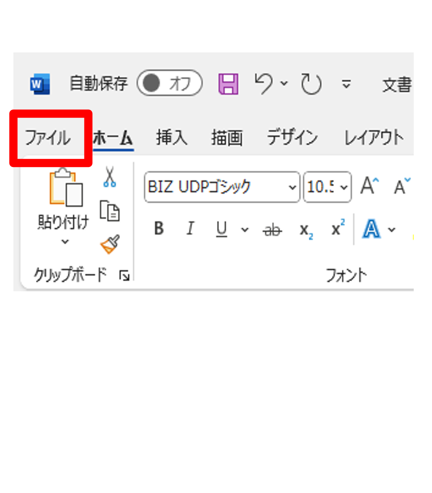 今回はWordを開いております。左上にある「ファイル」のボタンを押下 -