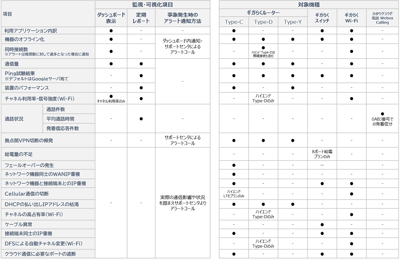 | トラブル予兆通知 | 予兆通知 | ベンチマークからの乖離率やDHCP枯渇、IP重複、機器オフラインなど、ネットワークの利用に影響があると判断される事象について、ダッシュボード等を通じて通知 |