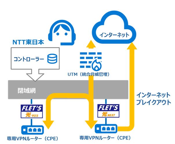 閉域網内からインターネットサービスプロバイダを経由してインターネットに接続でき、UTM(統合脅威管理)機能によりセキュアな通信が可能となります。