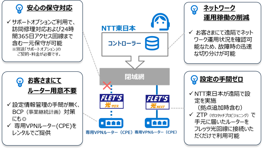 | サポートオプション | ・専用VPNルーター(CPE)の訪問修理交換 ・24時間365日の電話受付 ・フレッツ光を含めた一元受付対応(切り分け/故障手配) |