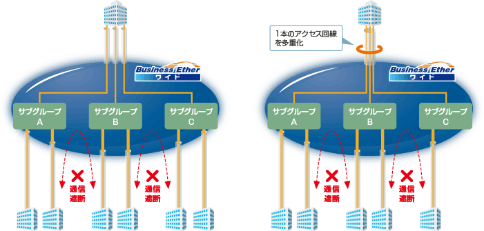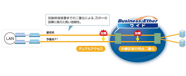 ビジネスイーサ ワイド網内は中継区間(中継装置や中継回線等)が二重構成となっており、万が一の故障発生時にも自動で迂回路へ切り替るため、基幹系や勘定系ネットワークといった重要な回線としても安心してご利用いただけます。