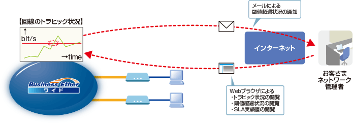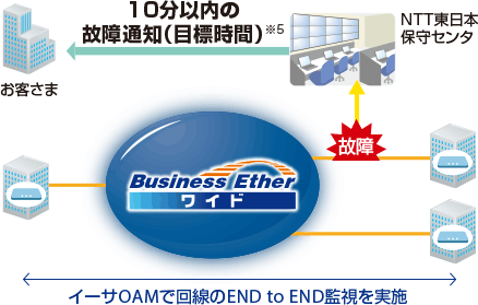 ビジネスイーサ ワイドでは、イーサOAM技術を採用することで、アクセス回線ごとの常時監視※2およびメールによる故障通知※3※4が可能です。万が一故障が発生した際にも迅速に故障切り分けを行います。