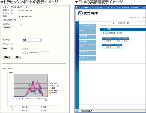 お客さまのご利用回線ごとにトラヒックの変動状況やSLAの実績値をWebでレポートとしてご提供するサービスです。