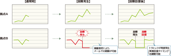 • 通常時のトラヒック状態を把握し、故障発生、故障回復の状況をトラヒック状況から把握できます。