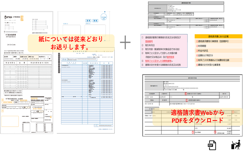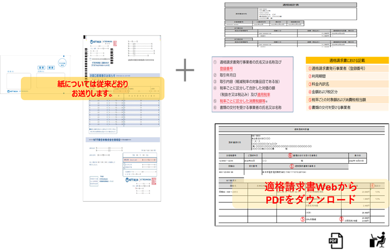 ※適格請求書は、「料金請求書」や「口座振替のお知らせ」とは別にPDFファイルで提供します。書面が必要な場合は、お客さま自身で印刷をお願いします。
